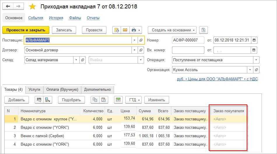 Работайте с запасами в Приходной накладной, используя Заказы покупателей.