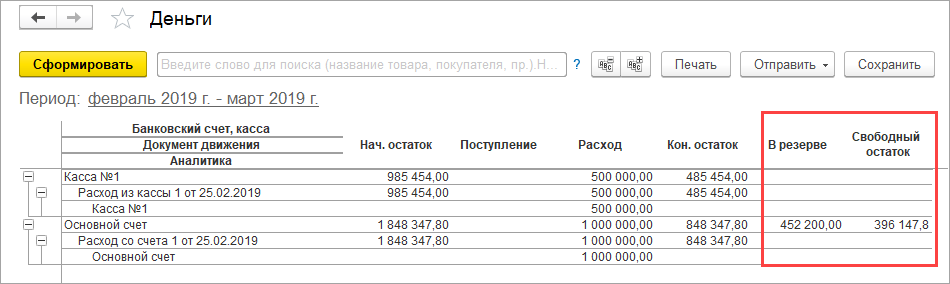 Зарезервированные суммы и остатки с учетом резервов доступны в отчетах: Деньги, Остатки денег.