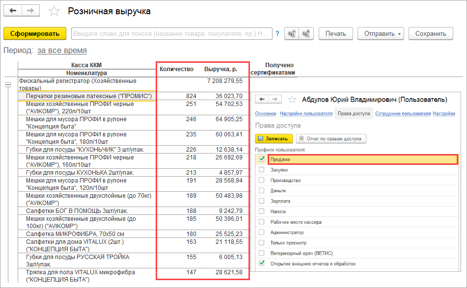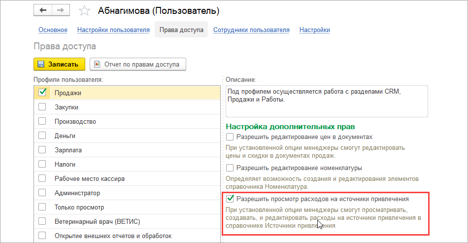 Такое решение позволит задать сотрудникам доступные счета и кассы. Или, например, скрыть от менеджеров закупочные цены в карточках товара и прайс-листе.