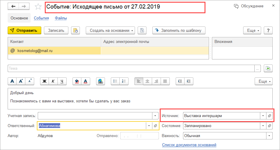 Указывайте в карточке источника e-mail, телефон. При наступлении события источник автоматически заполняется введенными данными.