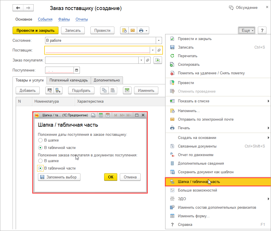 Теперь переключайте расположение заказов покупателей в заказе поставщику, используя команду Шапка/табличная часть кнопки Еще или контекстного меню.