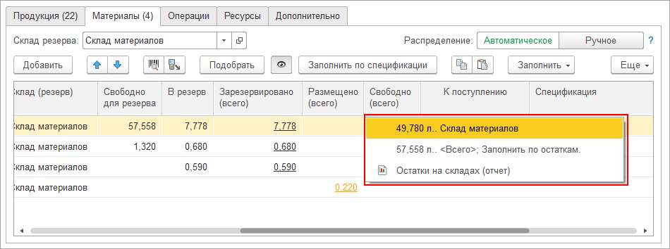 В колонках Зарезервировано (всего), Размещено (всего), Свободно (всего) и К поступлению можно получить расшифровку, кликнув левой кнопкой мыши на значение.