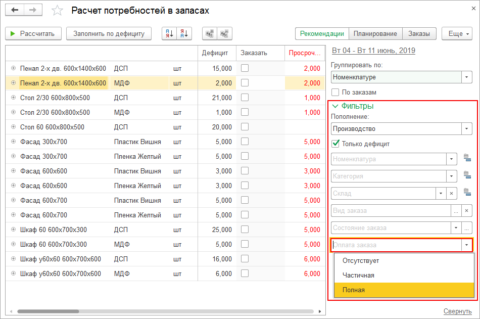 Например, можно рассчитать потребность только для оплаченных или утвержденных заказов.