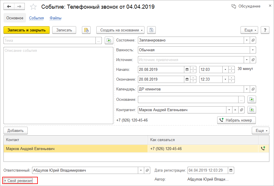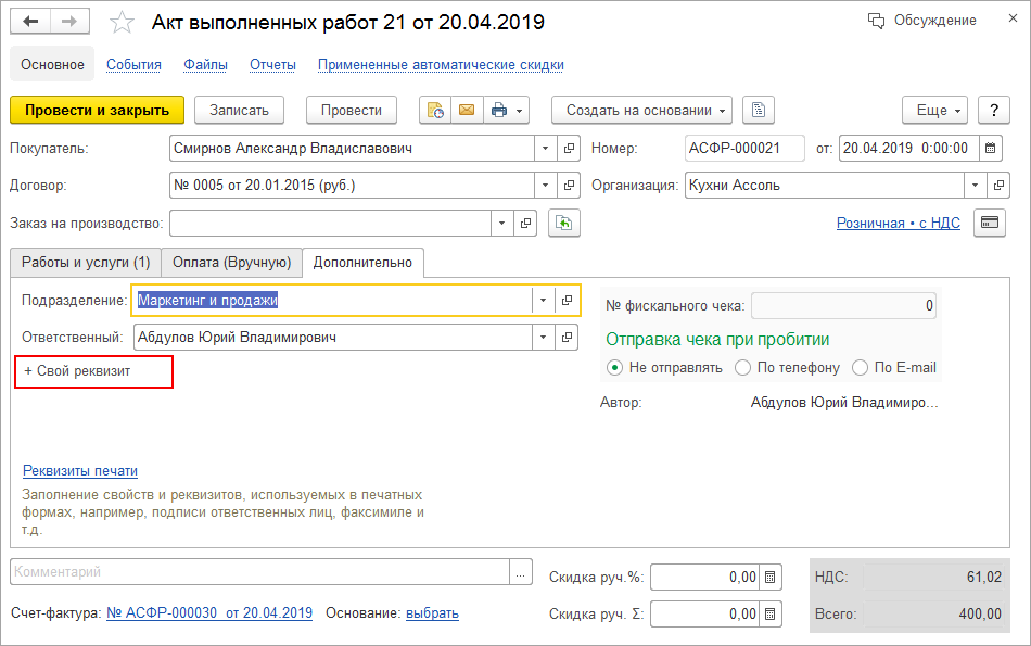 Появилась возможность быстро добавлять свои реквизиты в документы. Сделать это можно в любом документе, где есть ссылка + Свой реквизит на закладке Дополнительно или в одноименной группе.