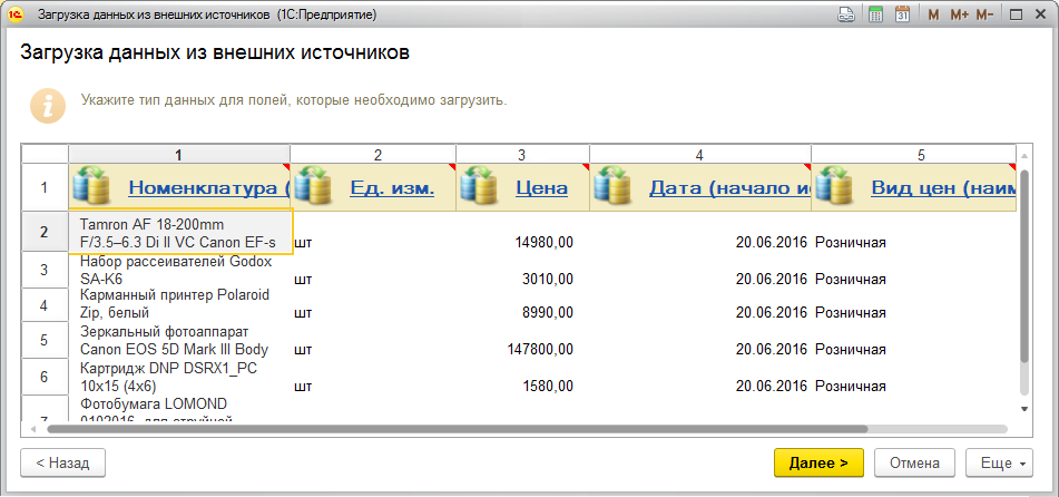 Теперь, при загрузке данных из файла, сопоставление колонок документа с реквизитами объектов 1С:УНФ выполняется автоматически. Пользователю остается только проверить, что все поля подобраны верно.