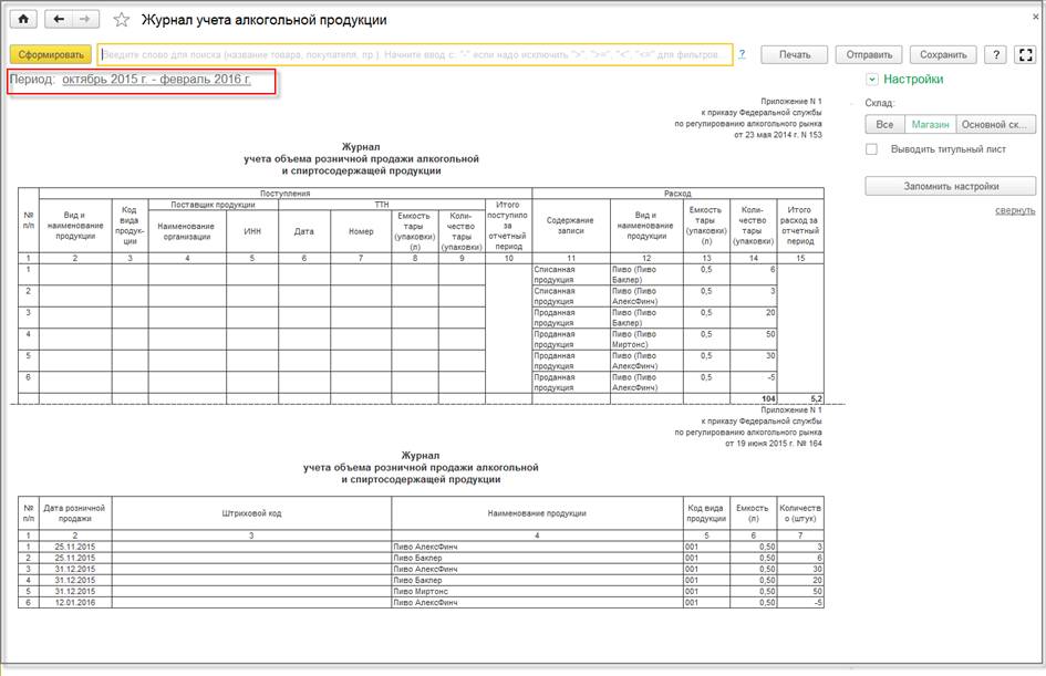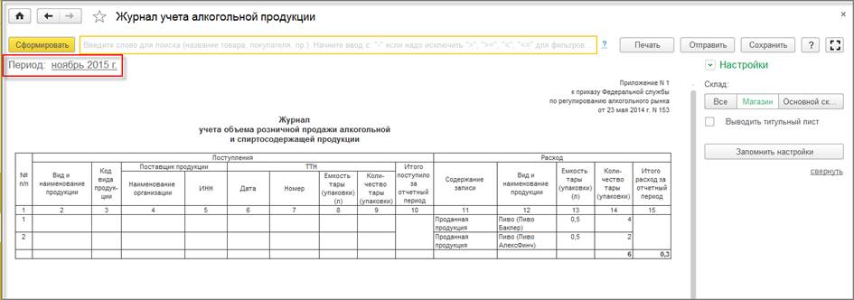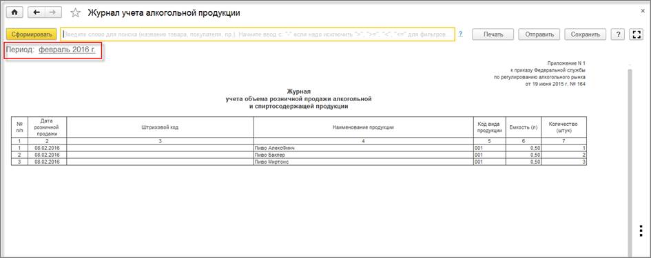 С 01.01.2016 вступает в силу новая форма журнала учета объема розничной продажи алкогольной продукции, утвержденный приказом ФСРАР от 19.06.2015 № 164. В программе этот журнал заполняется по данным учета автоматически. При формировании отчета анализируется период, за который отчет должен быть сформирован и выводится старая или новая форма отчета.