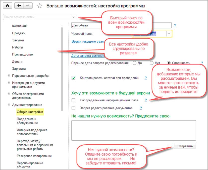 Нужной возможности еще нет в программе? Вы можете проголосовать за потенциальные возможности из списка предлагаемых или описать потребность своими словами и отправить нам письмо.