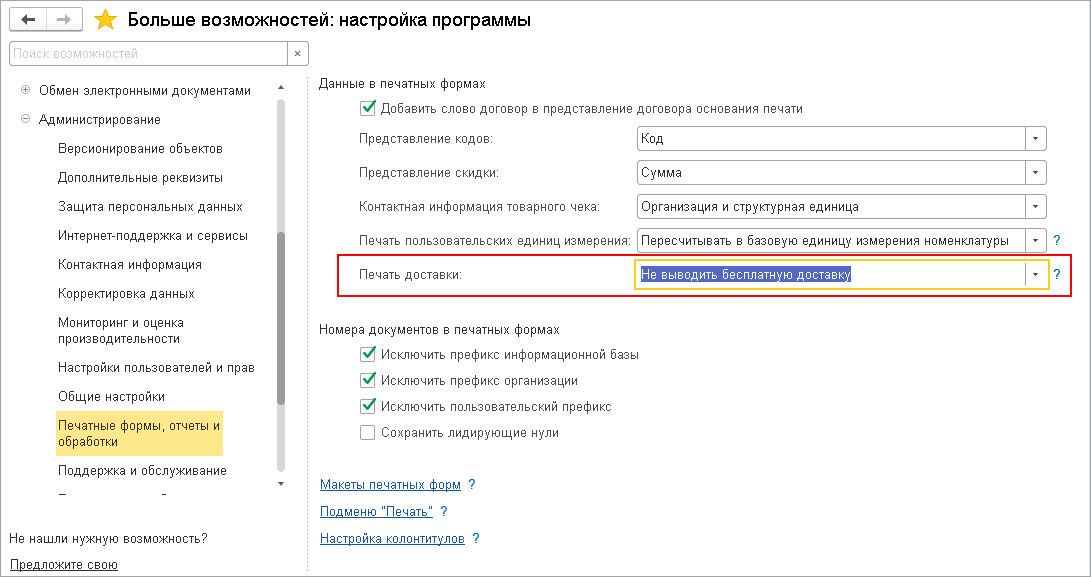 Теперь в печатных формах появилась возможность не выводить информацию о бесплатной доставке.