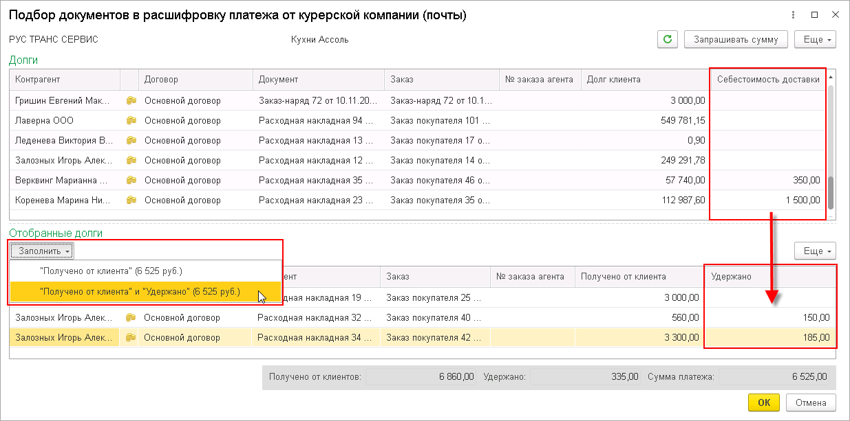 Также информация о себестоимости доставки используется в форме подбора для заполнения колонки Удержано при ручном подборе заказов и накладных.