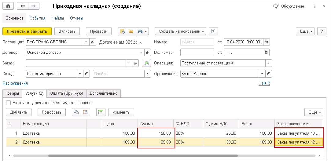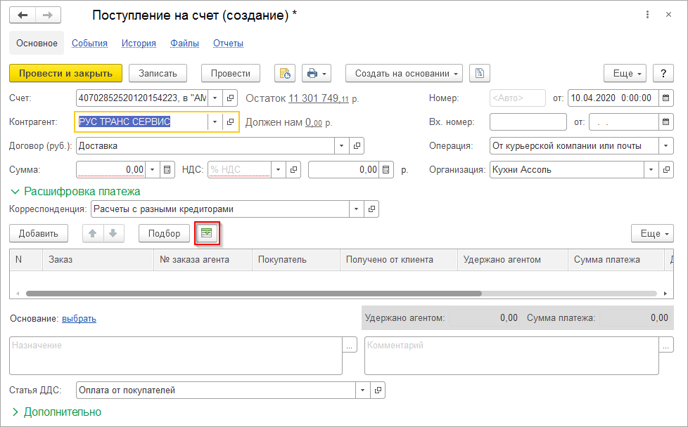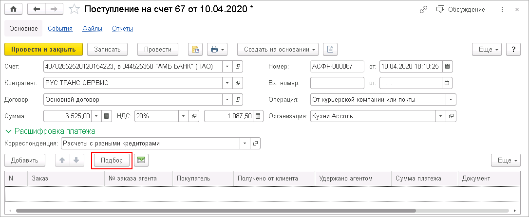 Теперь можно заполнить табличную часть на закладке Услуги данными о заказах из поступления на счёт и суммами, которые удержал агент.