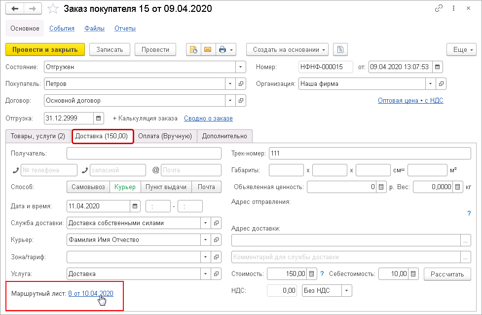 Также появилась возможность из Заказа покупателя на закладке Доставка открыть маршрутный лист.