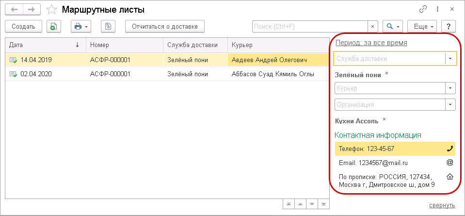 Теперь маршрутные листы можно отбирать по периоду оформления документа, курьеру, службе доставки и организации.
