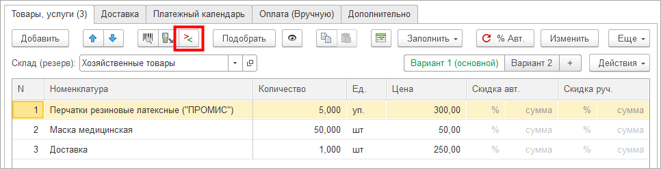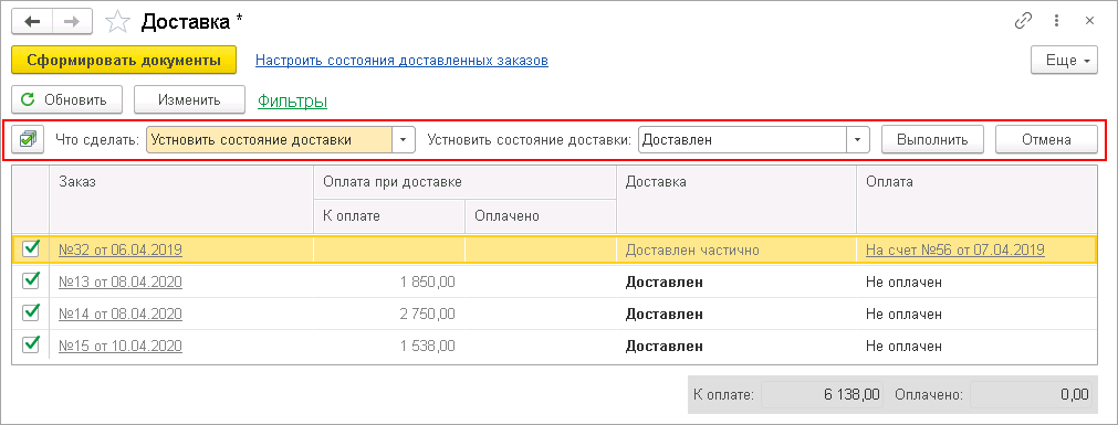 Завершите заполнение документа Доставка по кнопке Выполнить.