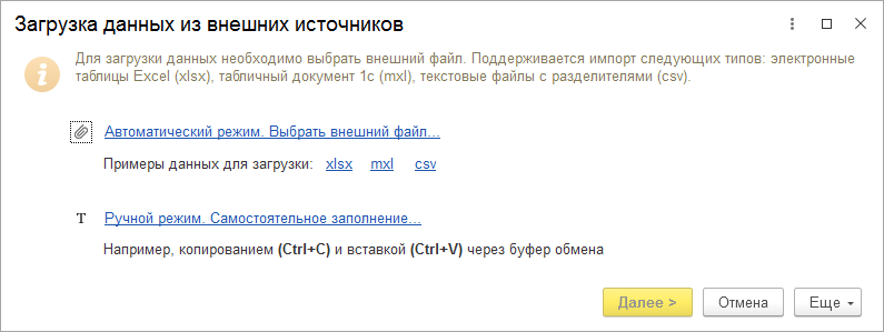 Поддерживается импорт из файлов: *.xlsx, *.mxl, *.csv.