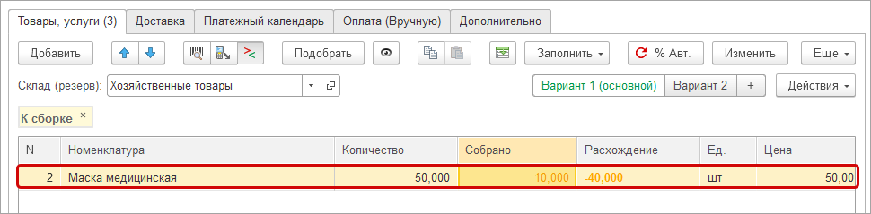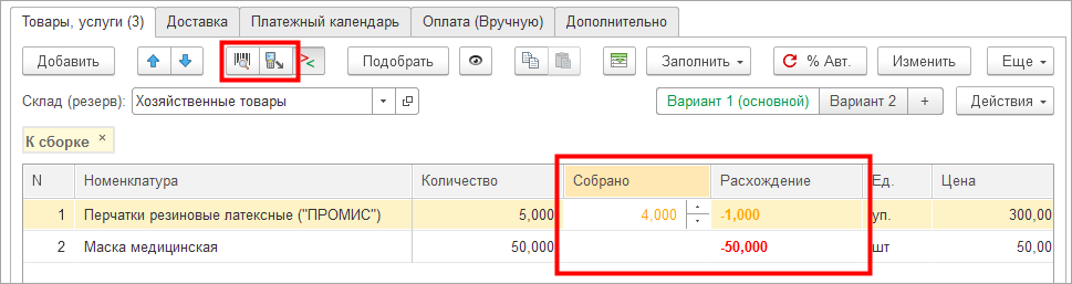 Расхождение показывается количество, которое необходимо собрать: разница между колонками Собрано и Количество.