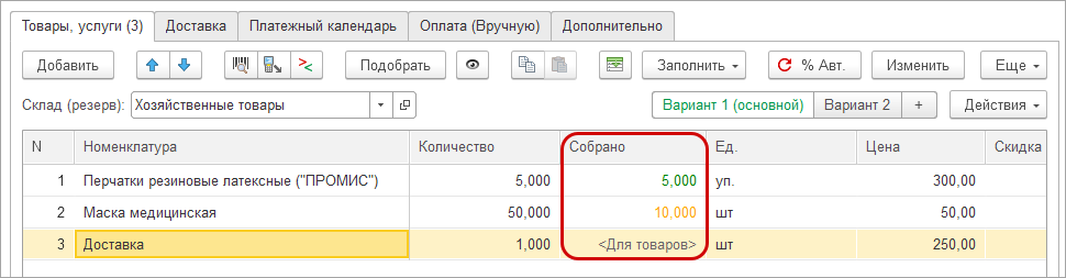В режиме сборки становятся доступны две дополнительных колонки: Собрано и