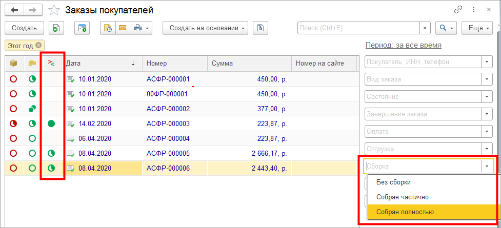 По этой колонке можно быстро сделать отбор заказов, готовых к отгрузке, а также тех, сборка которых не завершена.