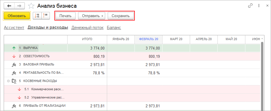 Все отчеты инструмента "Анализ бизнеса" теперь можно сохранить и распечатать. Для этого в форму добавлены удобные команды: