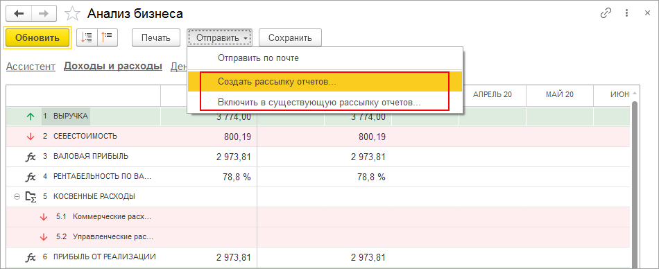 Все отчеты раздела "Анализ бизнеса" можно включить в автоматическую рассылку по электронной почте и получать актуальную информацию о состоянии дел в компании не заходя в 1С.