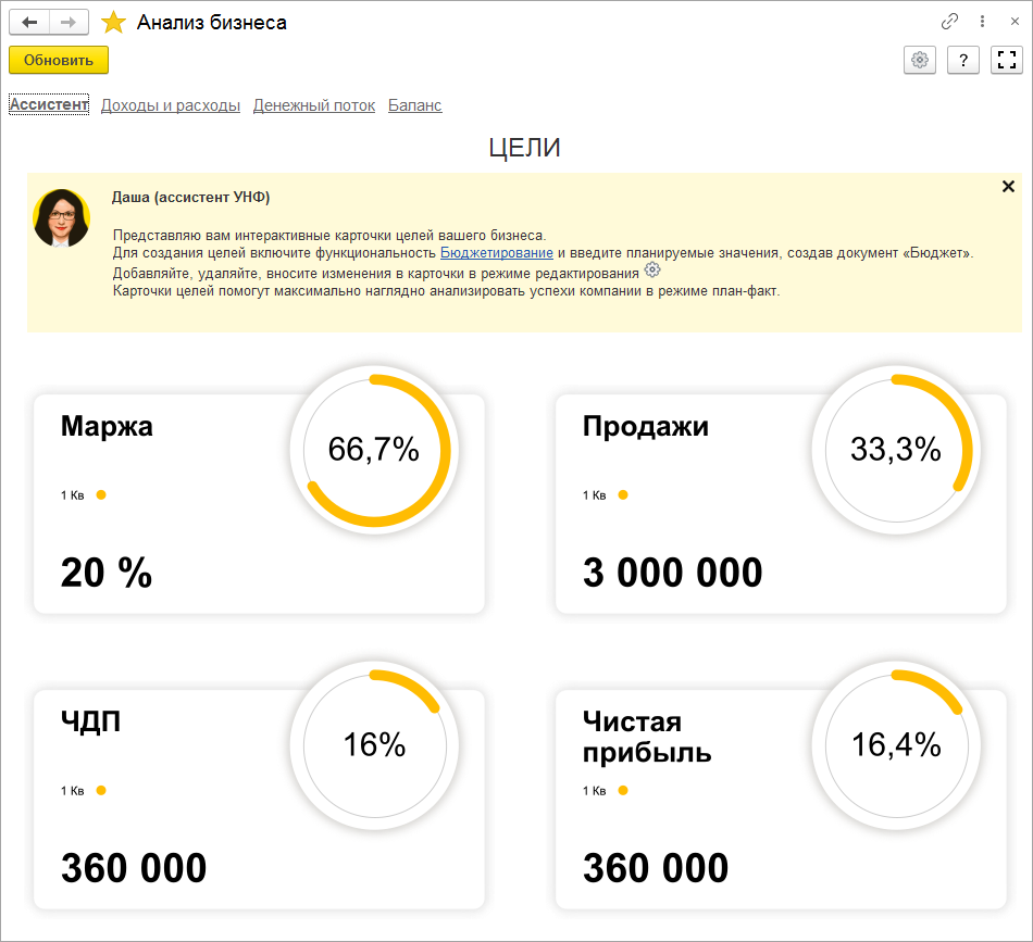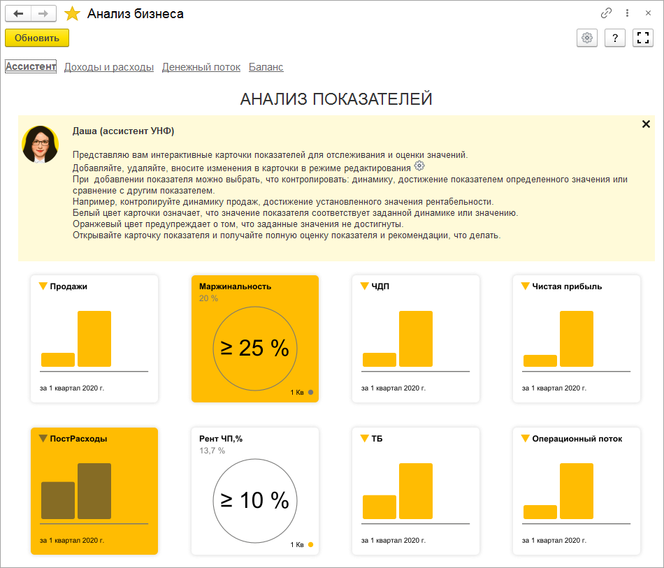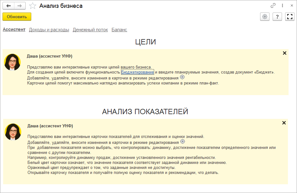 В новой версии мы продолжили развивать инструмент для финансового планирования "Анализ бизнеса". Теперь управлять развитием бизнеса помогает финансовый ассистент, Даша. С ее помощью вы можете: