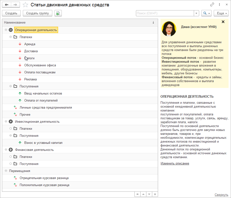 Для новых пользователей, начинающих работать в 1С:УНФ, справочник будет заполнен наиболее используемыми статьями с разделением на денежные потоки.