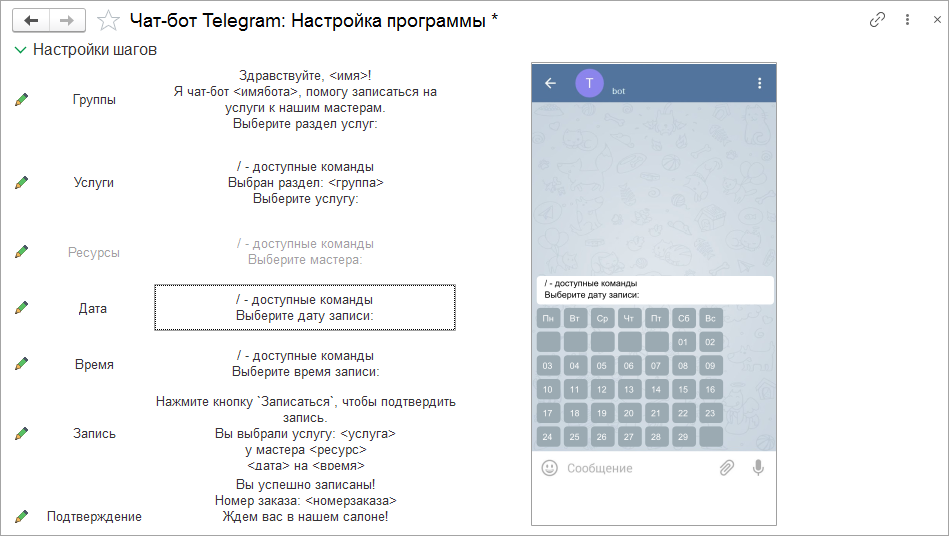В момент настройки диалога чат-бота сразу можно проверить, как это отображается у клиента. Мы добавили визуализацию работы чат-бота на каждом этапе записи.