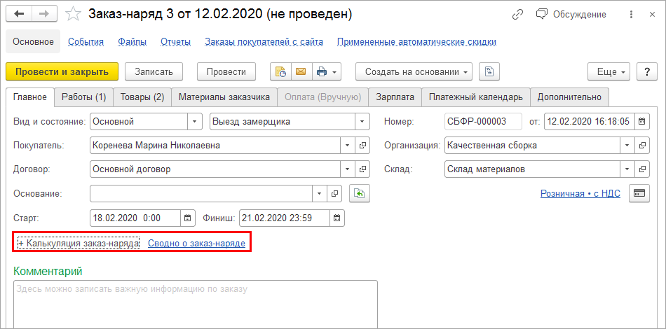При планировании подрядных работ появилась возможность быстро рассчитать предварительную стоимость работ и материалов. В документ "Заказ-наряд" добавлен расчет калькуляций.