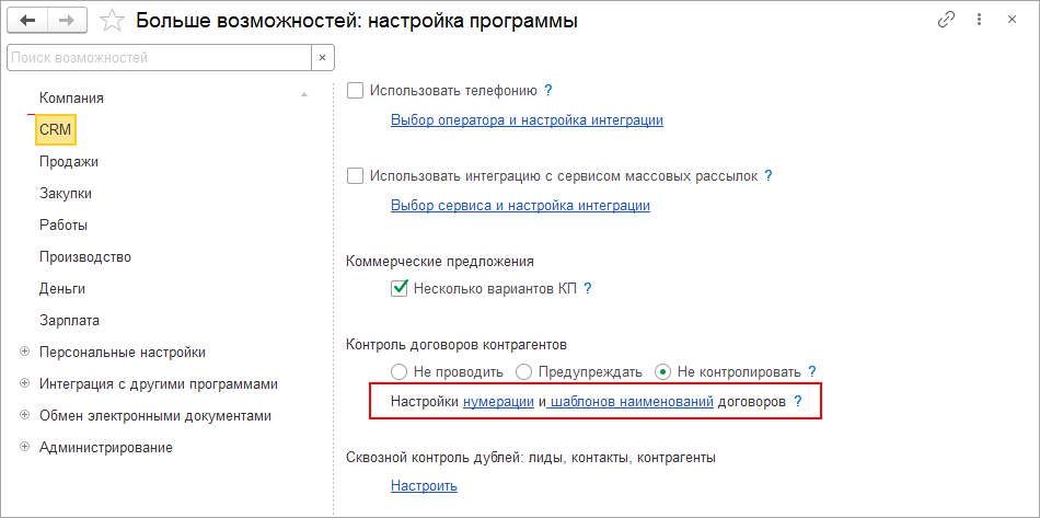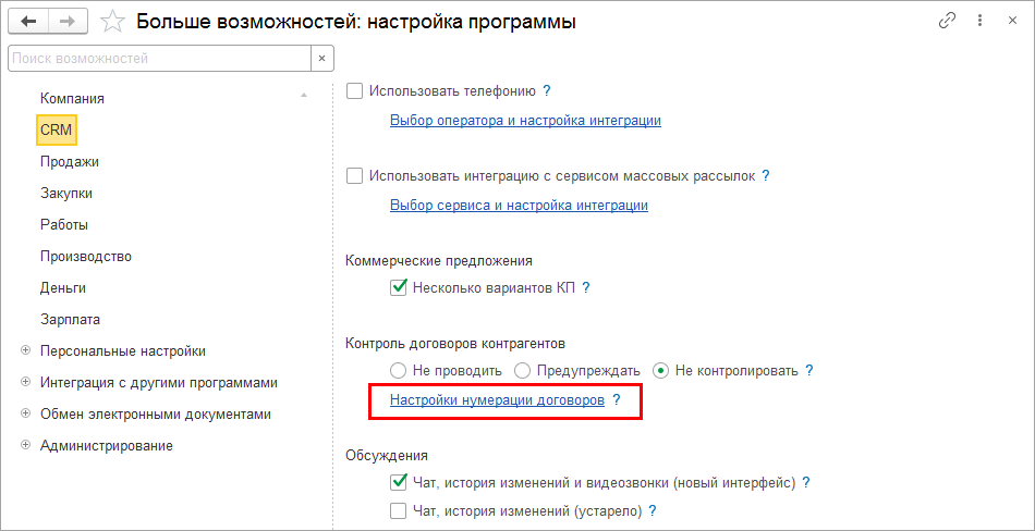 Настройки нумерации договоров выполняются в разделе CRM – Еще больше возможностей по гиперссылке Настройки нумерации договоров.