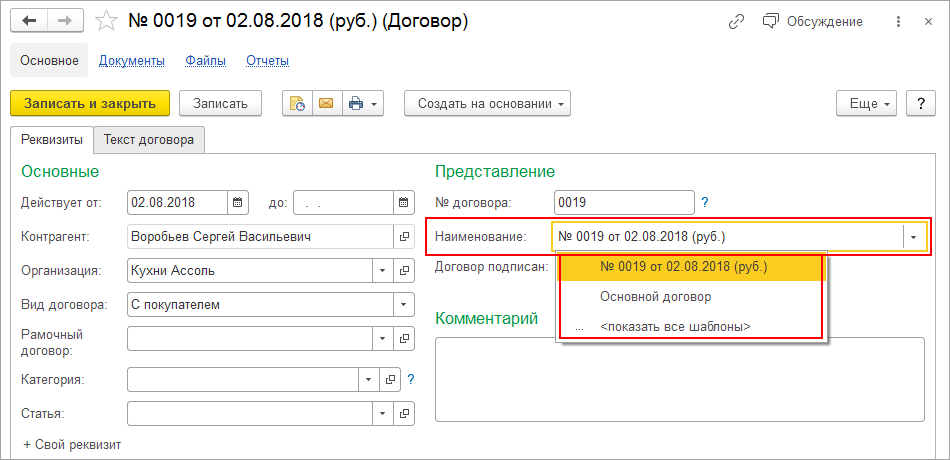 При создании договора теперь можно быстро заполнить его наименование по шаблону.