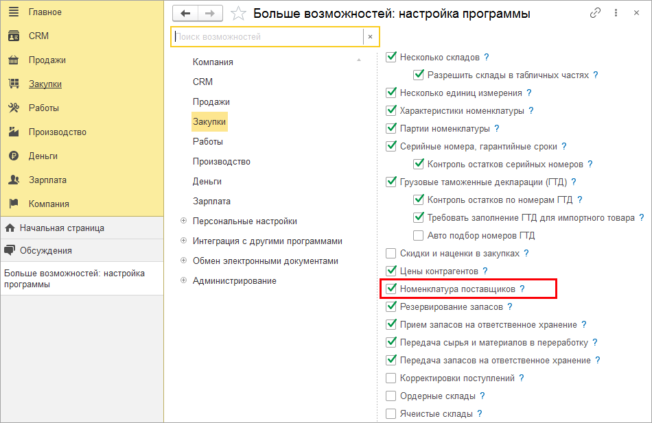 Для работы с товарами поставщиков необходимо в настройках раздела Закупки (Закупки – Еще больше возможностей) включить опцию Номенклатура поставщиков.