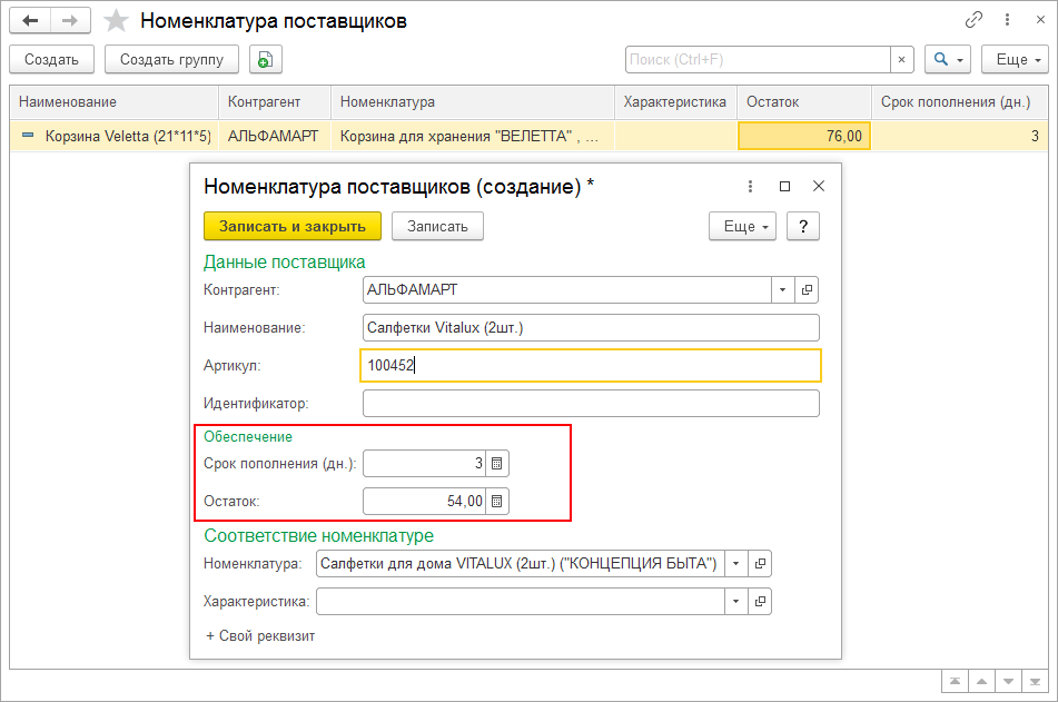 В карточке номенклатуры поставщика содержится информация о наименовании номенклатуры у конкретного поставщика, а также условия обеспечения номенклатуры: