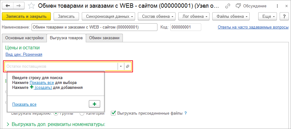 На вкладке Выгрузка товаров в поле Остатки поставщиков создайте новую Настройку выгрузки остатков поставщиков на сайт.