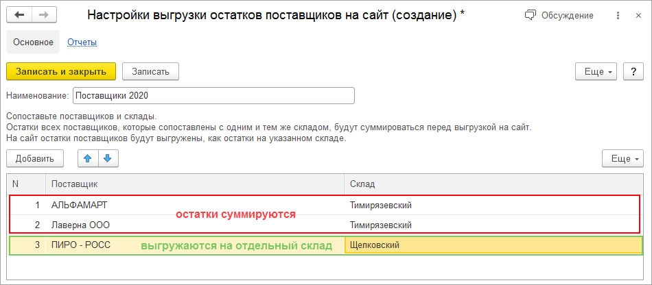 Для каждого поставщика, по которому требуется выгружать остатки на сайт, необходимо установить склад. Остаток товара со склада поставщика при такой настройке может суммироваться с собственным остатком, или отображаться как товар на отдельном складе со своим сроком доставки.
