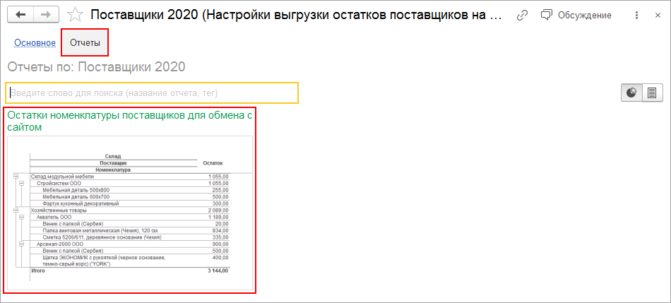 Контролировать и анализировать остатки товара на складах поставщиков поможет специальный отчет Остатки номенклатуры поставщиков для обмена с сайтом, доступный в настройках выгрузки остатков на сайт.