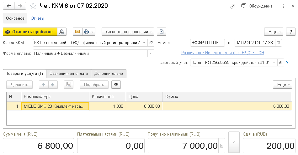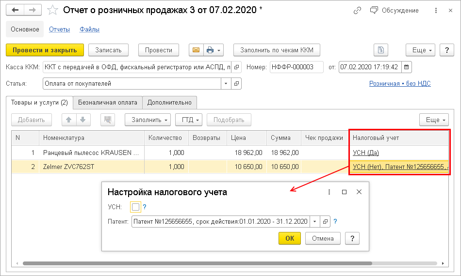 Если предприниматель использует только один режим налогообложения – Патент, то этот режим автоматически подставляется в документы. Для автоматического заполнения в настройках компании должна быть заполнена информация об актуальном патенте. Новая возможность поможет быстрее оформлять самые часто используемые документы: чеки ККМ (в том числе и через РМК), поступления на счет и в кассу, отчеты о розничных продажах и другие.
