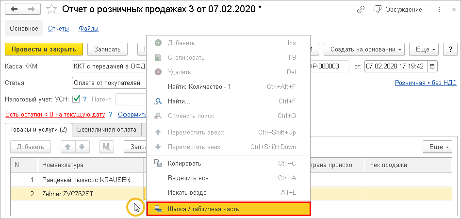 Пользователь может самостоятельно переключить режим отображения из контекстного меню (вызывается кликом ПКМ в таблице Товары и услуги) по команде Шапка/табличная.