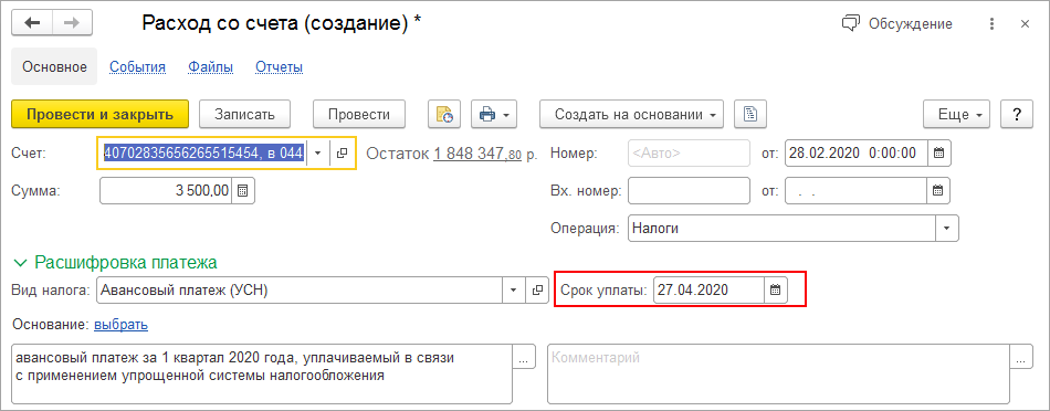 Платить налоги из 1С:УНФ удобнее с каждой версией. Теперь при оплате налога с помощью документов Расход из кассы и Расход со счета в документе автоматически заполняется информация о сроке уплате налога.