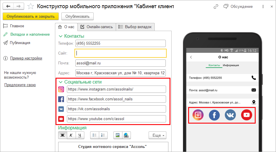 В приложении теперь можно добавить кнопки для социальных сетей. Приглашайте клиентов присоединяться к сообществам, рассказывайте о себе и повышайте их лояльность.