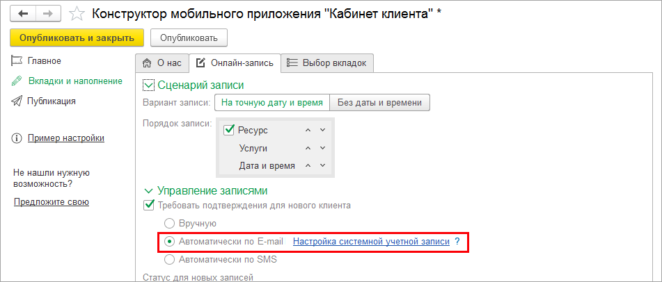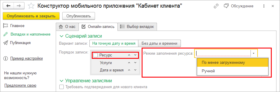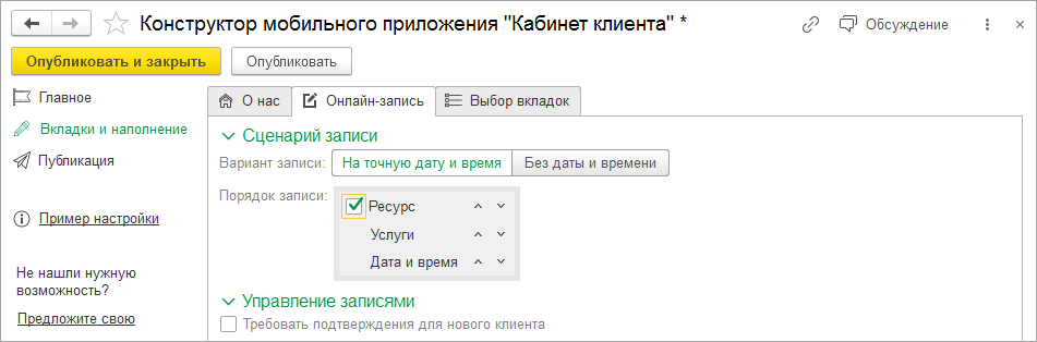 На закладке Вкладки и наполнение – Онлайн-запись настраивается Сценарий записи.