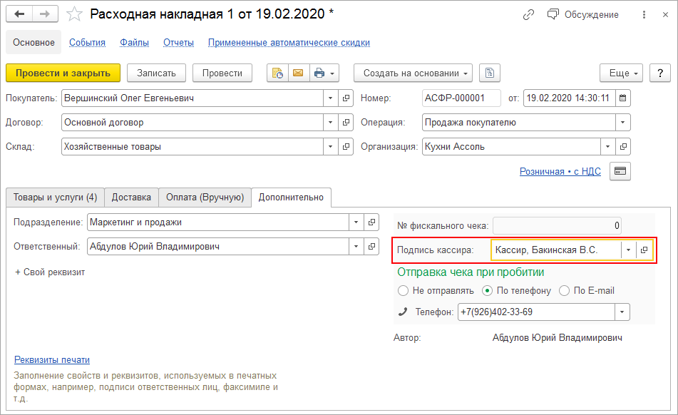 При печати кассового чека из документов теперь можно изменить фамилию кассира, ответственного за выдачу чека.