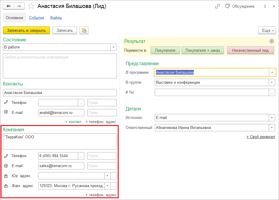 При первом контакте появилась возможность сохранить информацию о компании потенциального клиента в карточке лида.