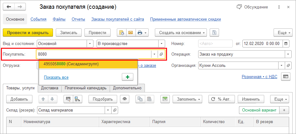 Например, при создании заказа начните вводить номер телефона в поле Покупатель и программа предложит вам подходящие варианты из справочника Контрагенты.