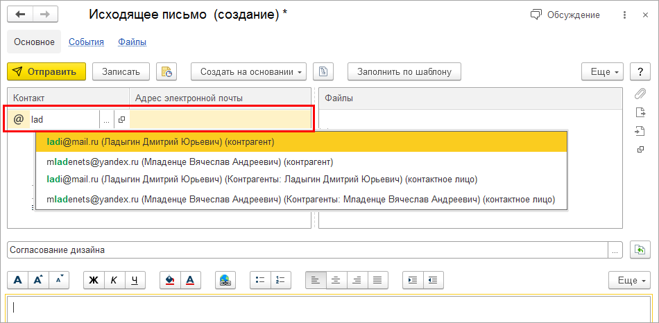 Также можно быстро подготовить письмо и подобрать получателя по e-mail.