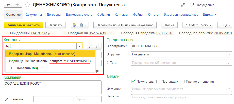 С помощью подсказки менеджер сможет безошибочно выбрать нужный контакт для нового контрагента или события.