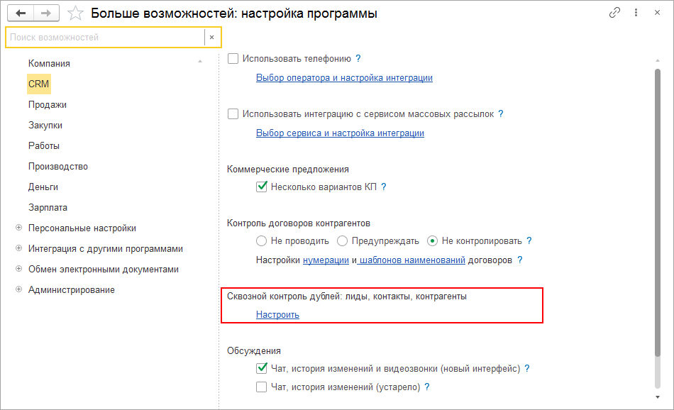 Для использования новой возможности необходимо предварительно настроить набор реквизитов для проверки. Сделать это можно в разделе CRM – Еще больше возможностей по гиперссылке Настроить.