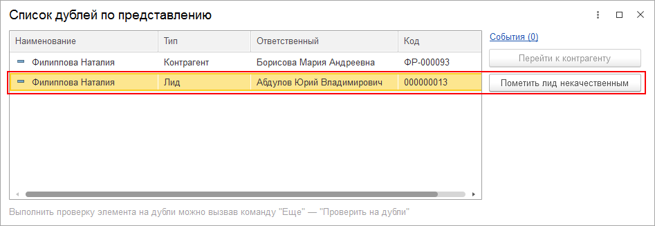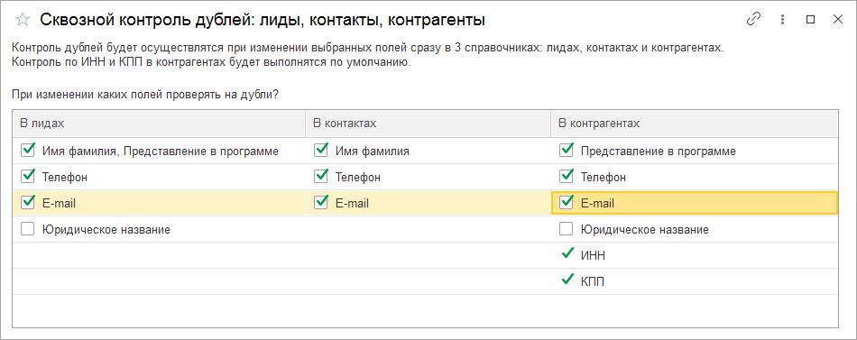 Проверка дублей выполняется при изменении полей с справочниках Лиды, Контакты, Контрагенты.