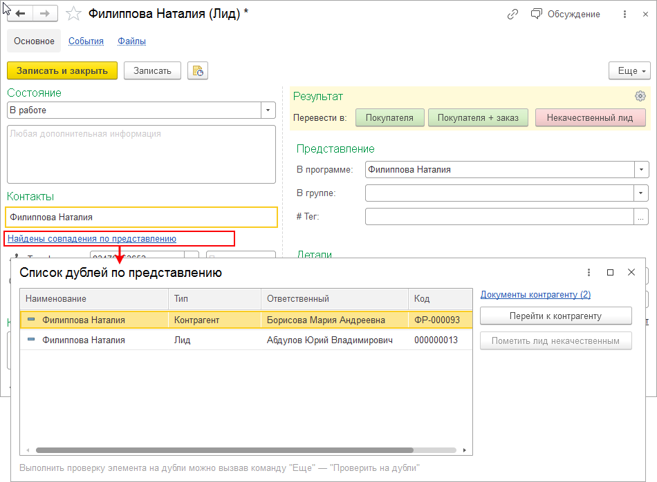 При записи информации о новом клиенте теперь вы сразу узнаете, работала ли ваша компания с ним ранее. Появилась уникальная возможность – сквозной контроль дублей лидов, контактов и контрагентов.