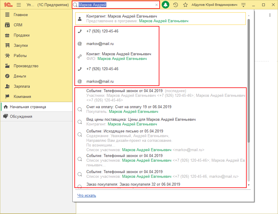 В новой версии улучшена выдача результатов глобального поиска. Например, с помощью строки глобального поиска теперь можно быстро найти последние взаимодействия с контактным лицом (события и заказы) и сразу связаться с ним по телефону или электронной почте.