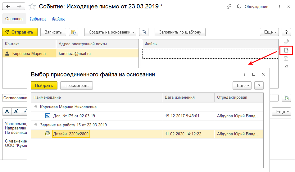 Можно выбрать файл, например, из карточки клиента, заказа покупателя или задания на работу.