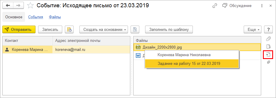 Также теперь в один клик можно сохранить файл из письма как присоединенный файл в карточке контрагента или документе-основания.